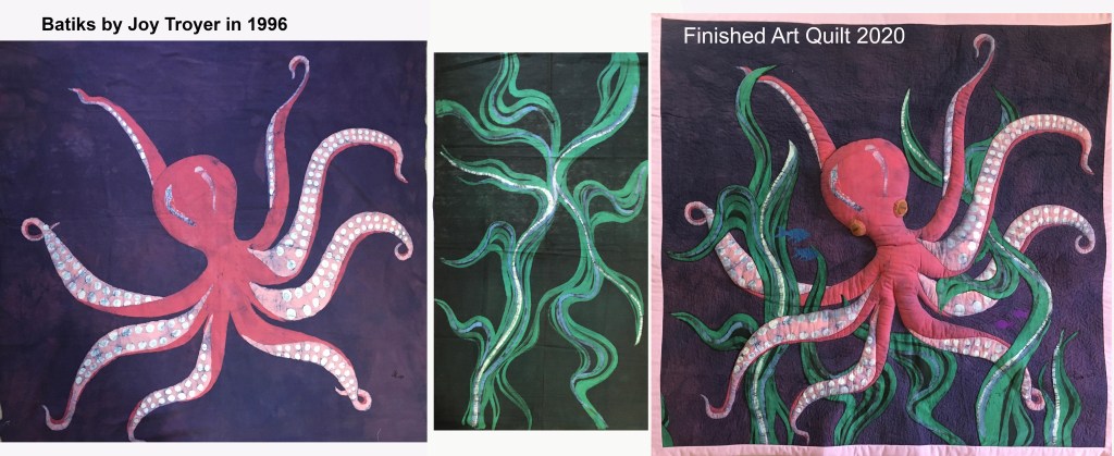During the Pandemic, a group of art quilters started meeting and giving ourselves a monthly “challenge.” The first one was to take something old and do anything to it to make it new. Before I moved to California (pre-2003) I did batik (waxing & dyeing fabric). I have a bin of “rejects that I just can’t make myself throw away.” In it I found my octopus (left image). It was rejected because it just felt kind of lonely, with no personality. Then I found the green swirly designs, which I had intended to look like rivers as seen from the sky. But the finished piece wasn’t very interesting. While looking for something old to transform, I happened to pull these two out of the reject bin and lay them side by side. I realized that together they could work. I cut out the green swirly pieces and appliqued them around the octopus. I stitched around the octopus and stuffed batting behind its legs and head to make it 3-dimensional. I added eyes (a big oversight in the original piece) and a few small fish. Finally, I quilted it. It is now a very happy octopus in its garden with friends.