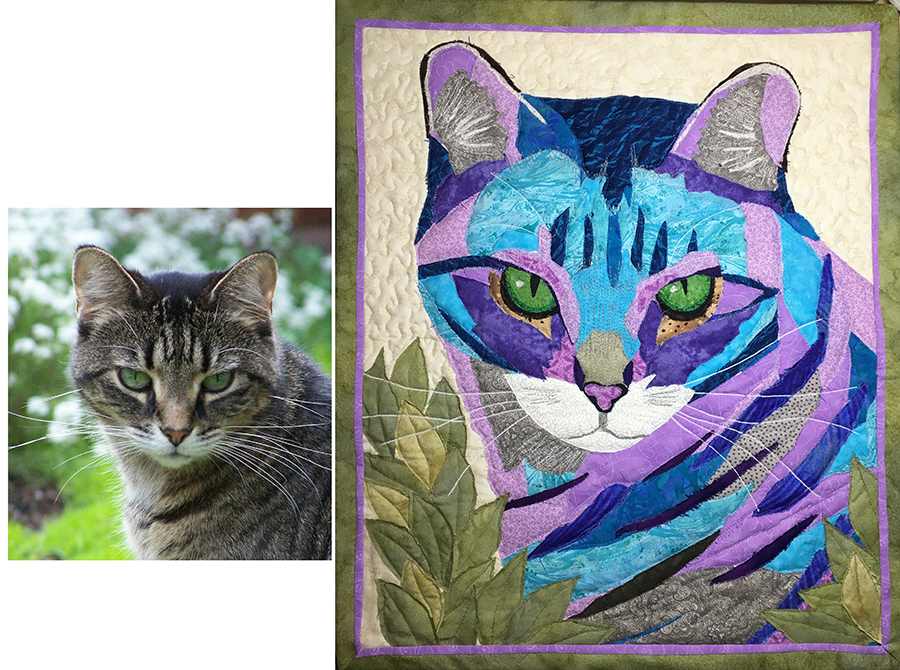 When I decided to make an art quilt of my cat, Kali, I pulled fabric in the colors of her fur. Then I thought, “I already have a photo of her. I don’t really need to make a quilt that looks just like the photo.” So, I put back the browns and pulled out purples and blues. I’m kind of glad that Kali’s fur wasn’t actually purple and blue. But inside, she was very colorful! And I miss her.