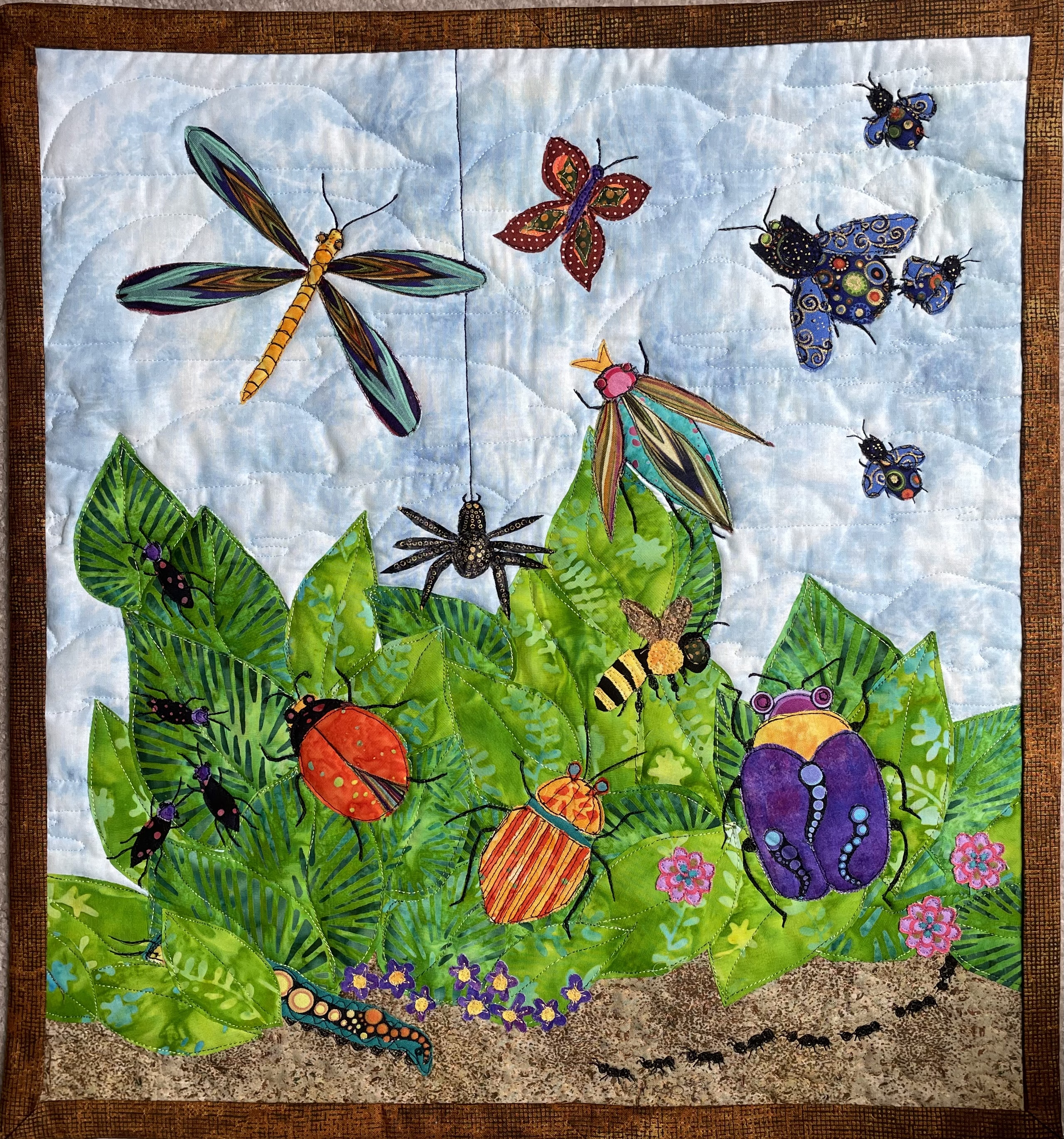 Quilts are made of 3 layers; a top, a layer of batting, and a back. The three layers are sewn together with “quilting”, stitching that goes through all 3 layers. Art quilts are small quilts intended to be hung on the wall. Each of these has a finished edge and a 4″ hanging sleeve on the back.