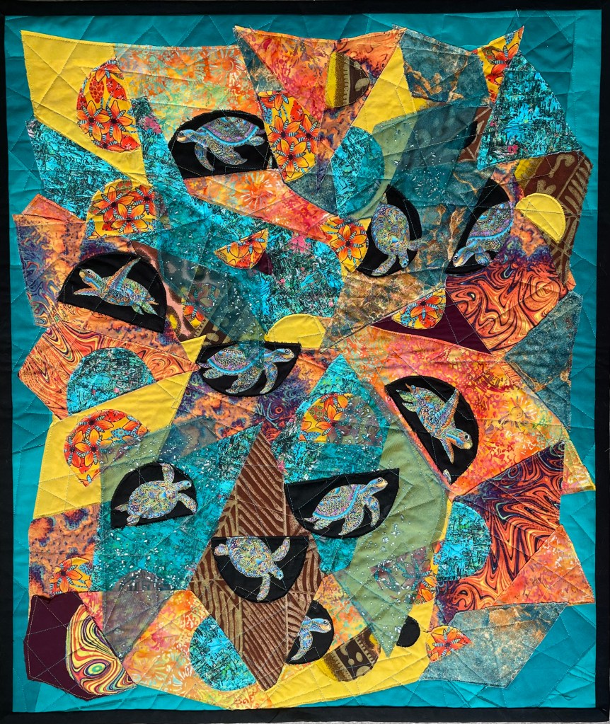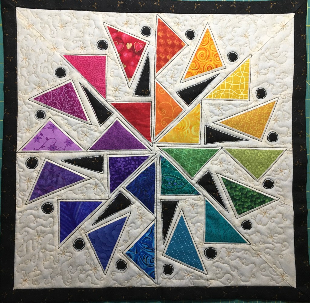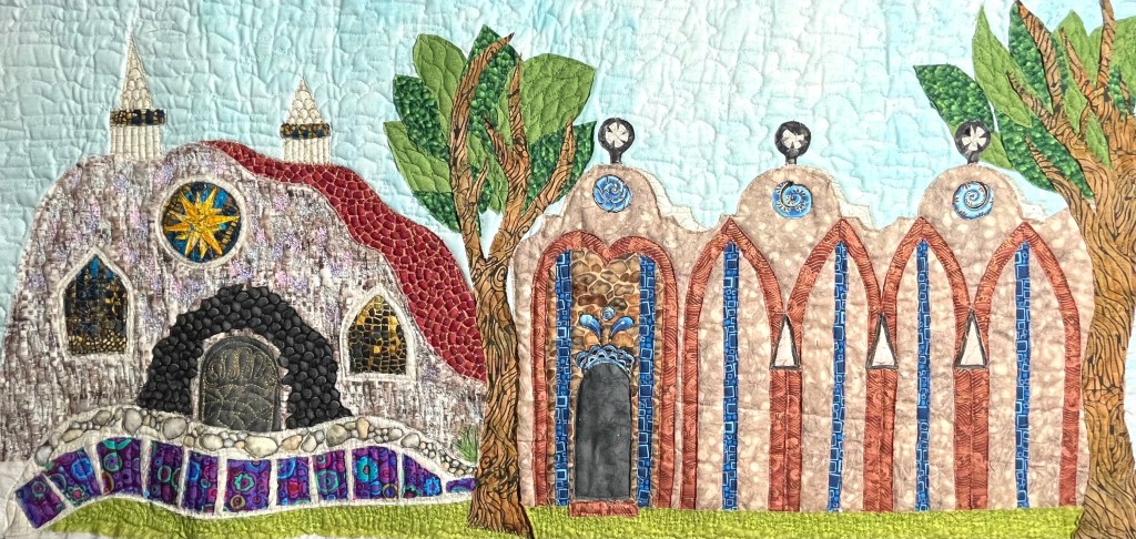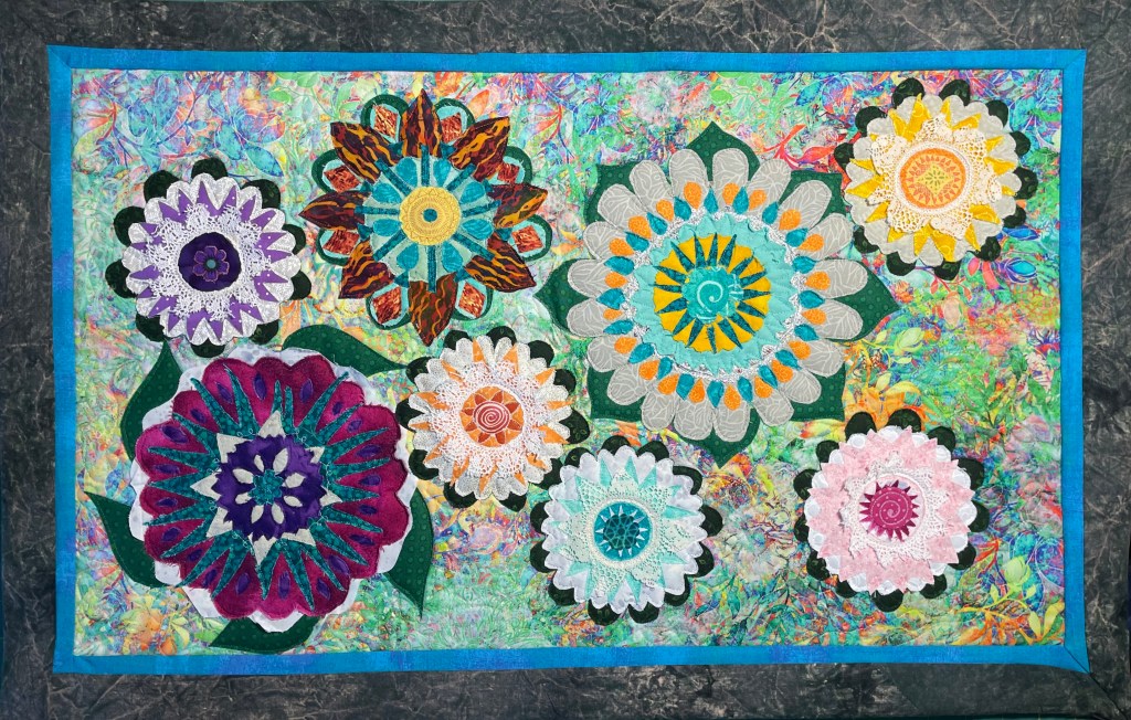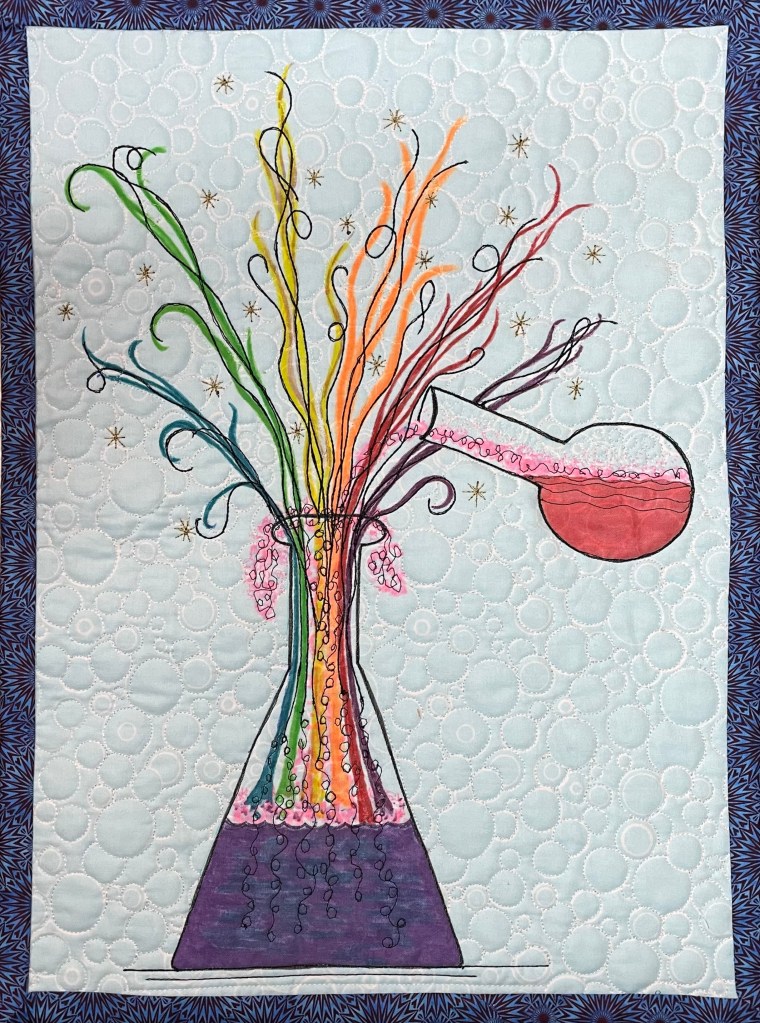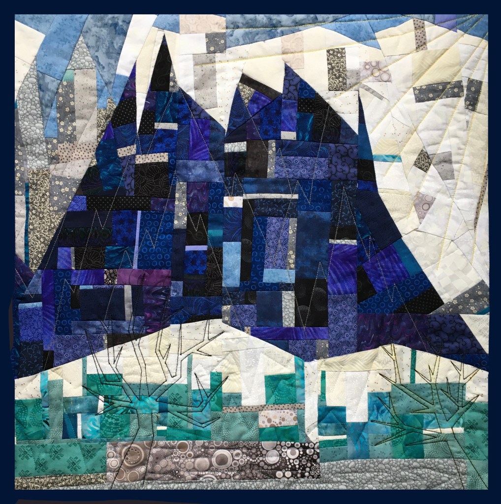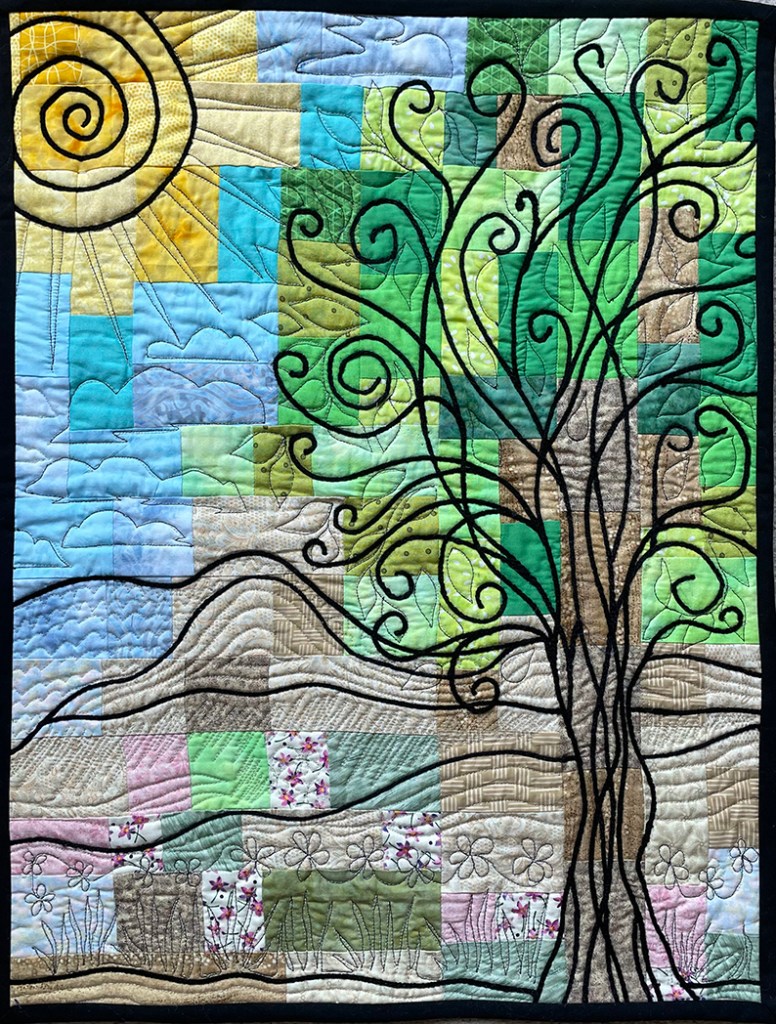 Quilts are made of 3 layers; a top, a layer of batting, and a back. The three layers are sewn together with “quilting”, stitching that goes through all 3 layers. Art quilts are small quilts intended to be hung on the wall. Each of these has a finished edge and a 4″ hanging sleeve on the back.