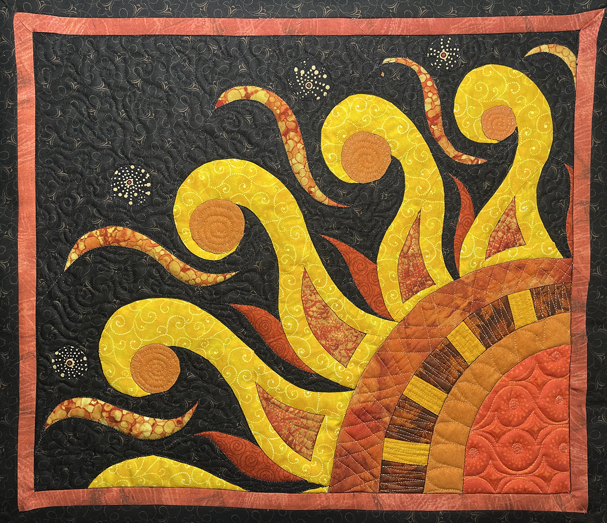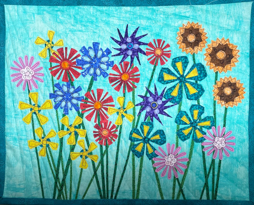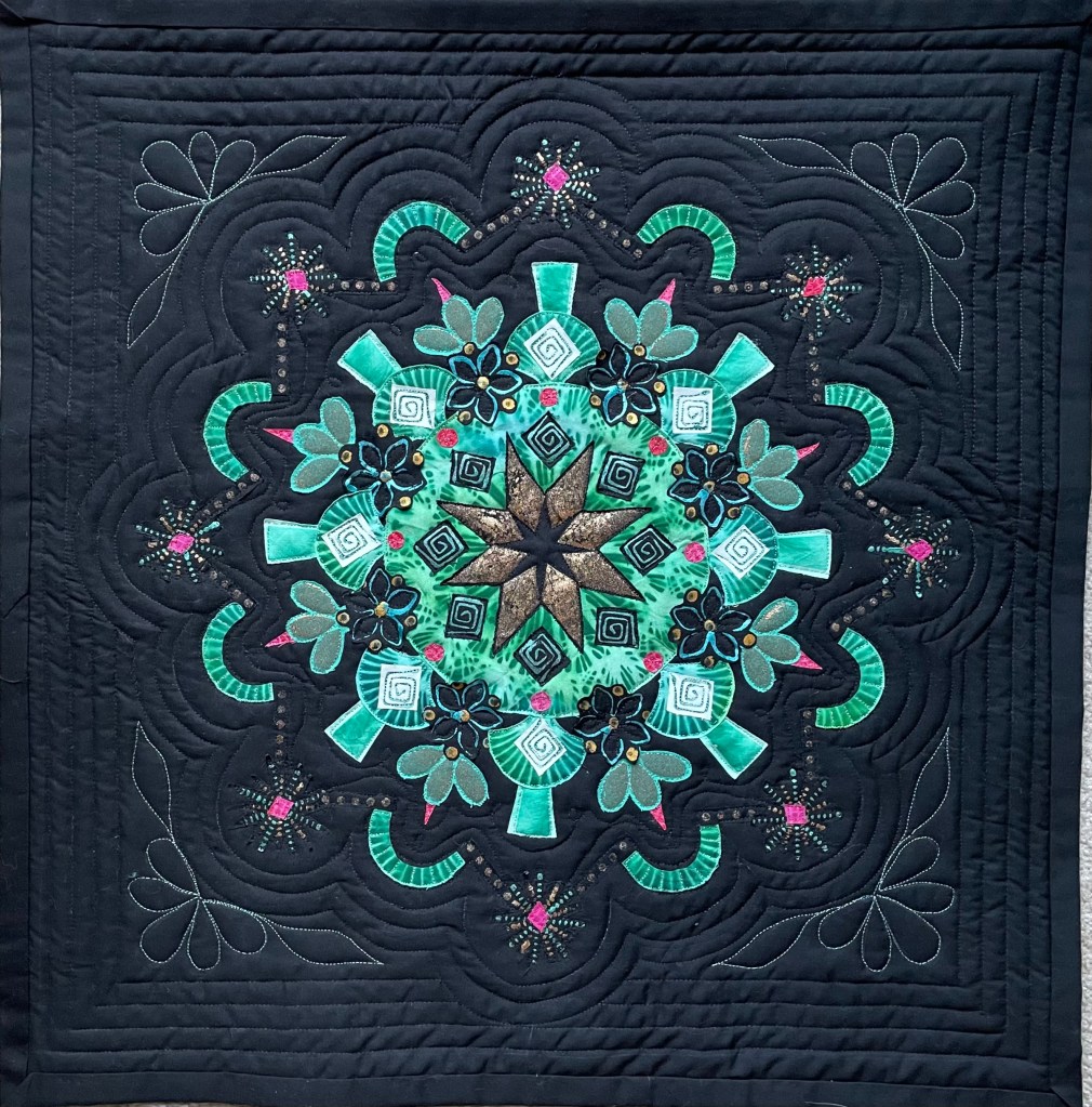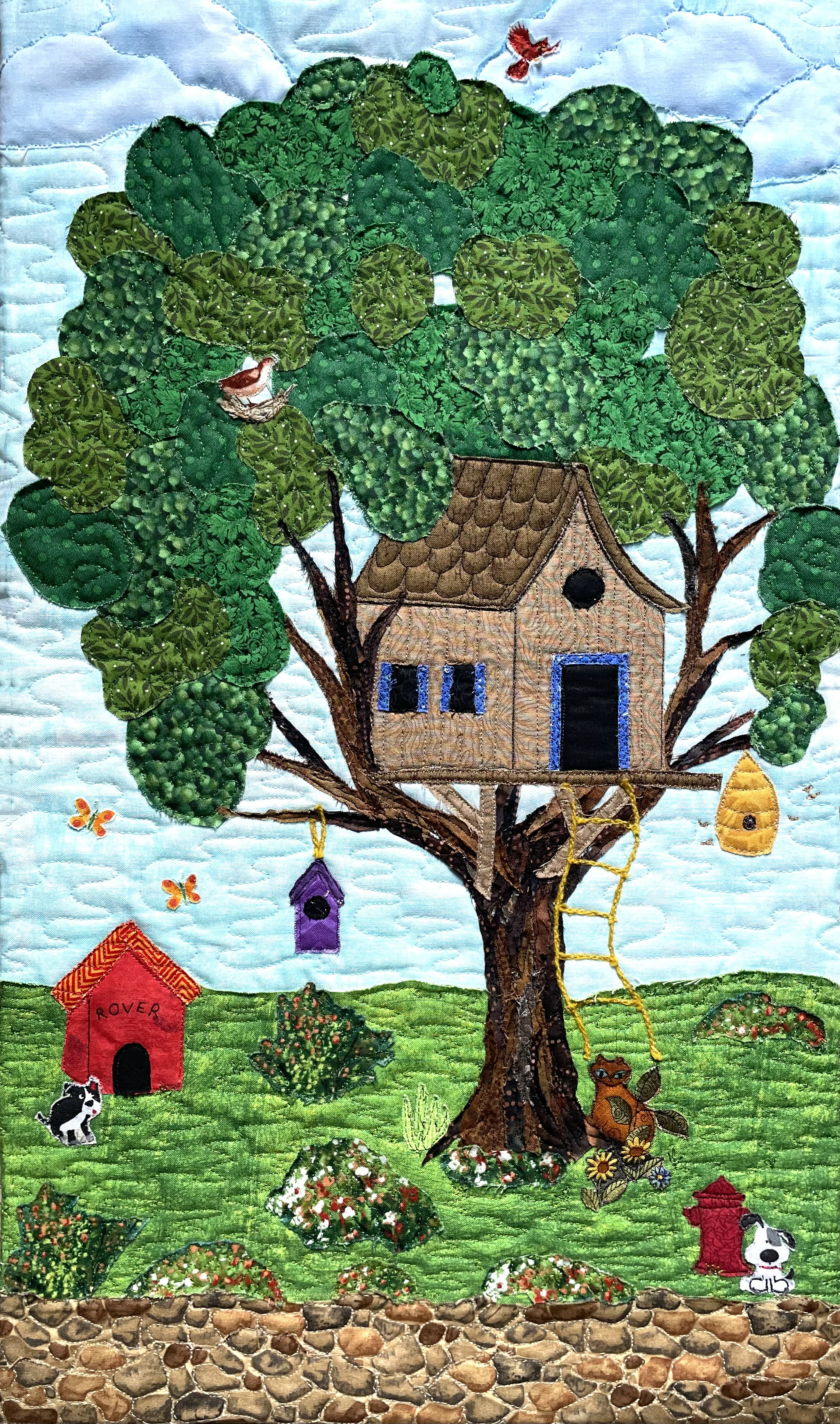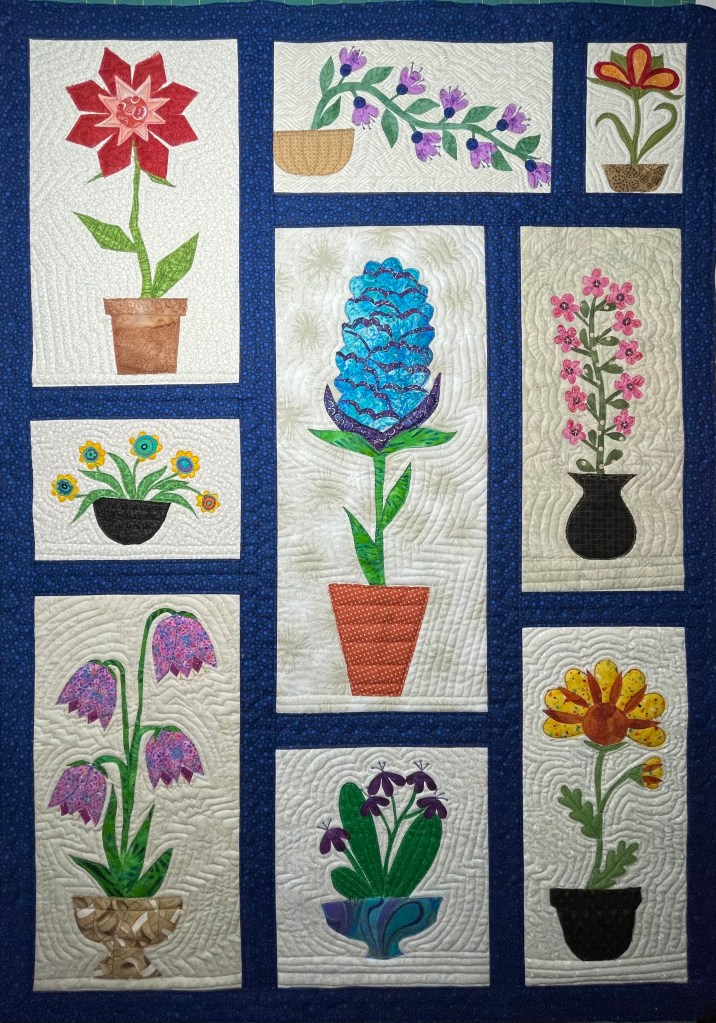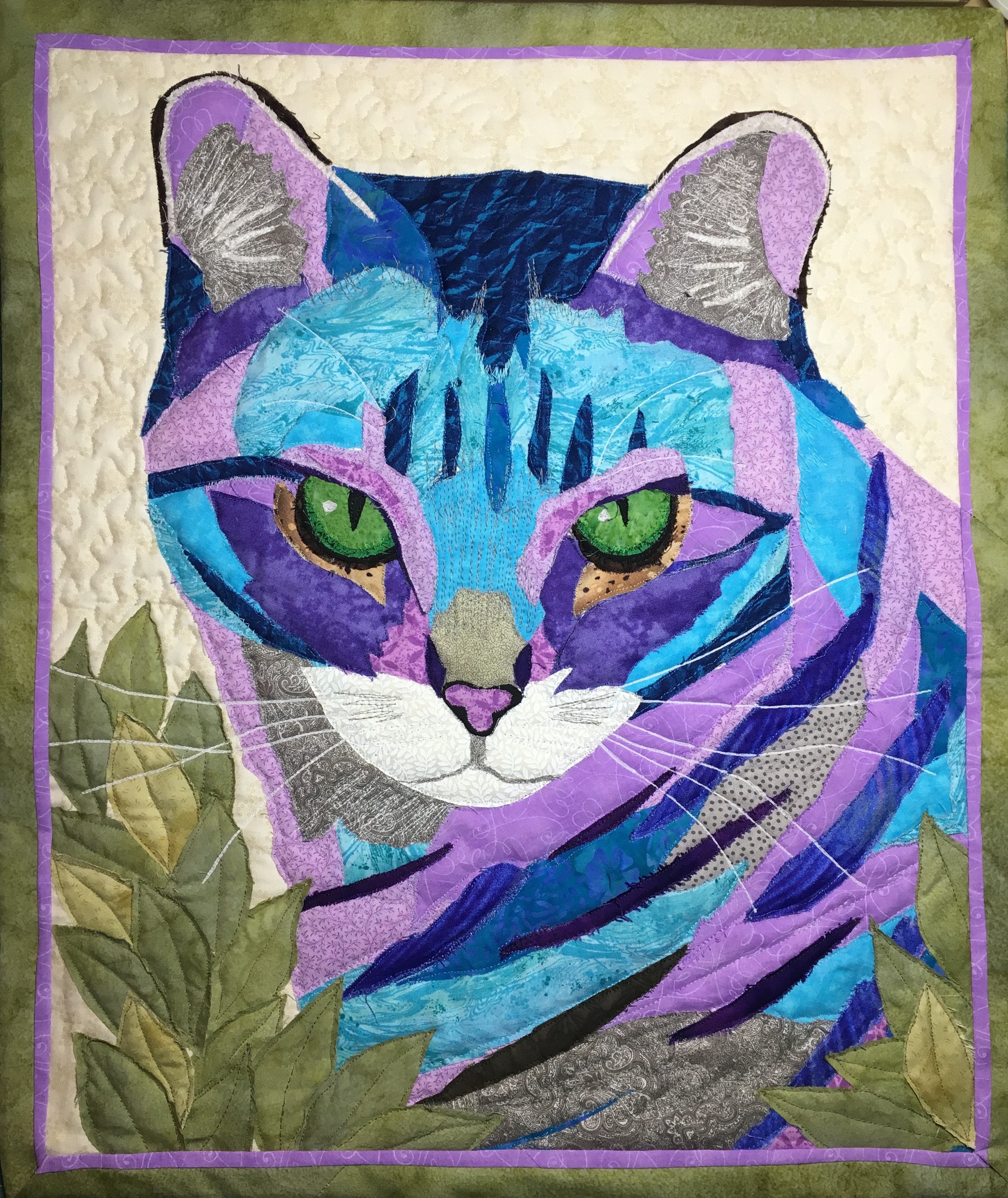 Quilts are made of 3 layers; a top, a layer of batting, and a back. The three layers are sewn together with “quilting”, stitching that goes through all 3 layers. Art quilts are small quilts intended to be hung on the wall. Each of these has a finished edge and a 4″ hanging sleeve on the back.