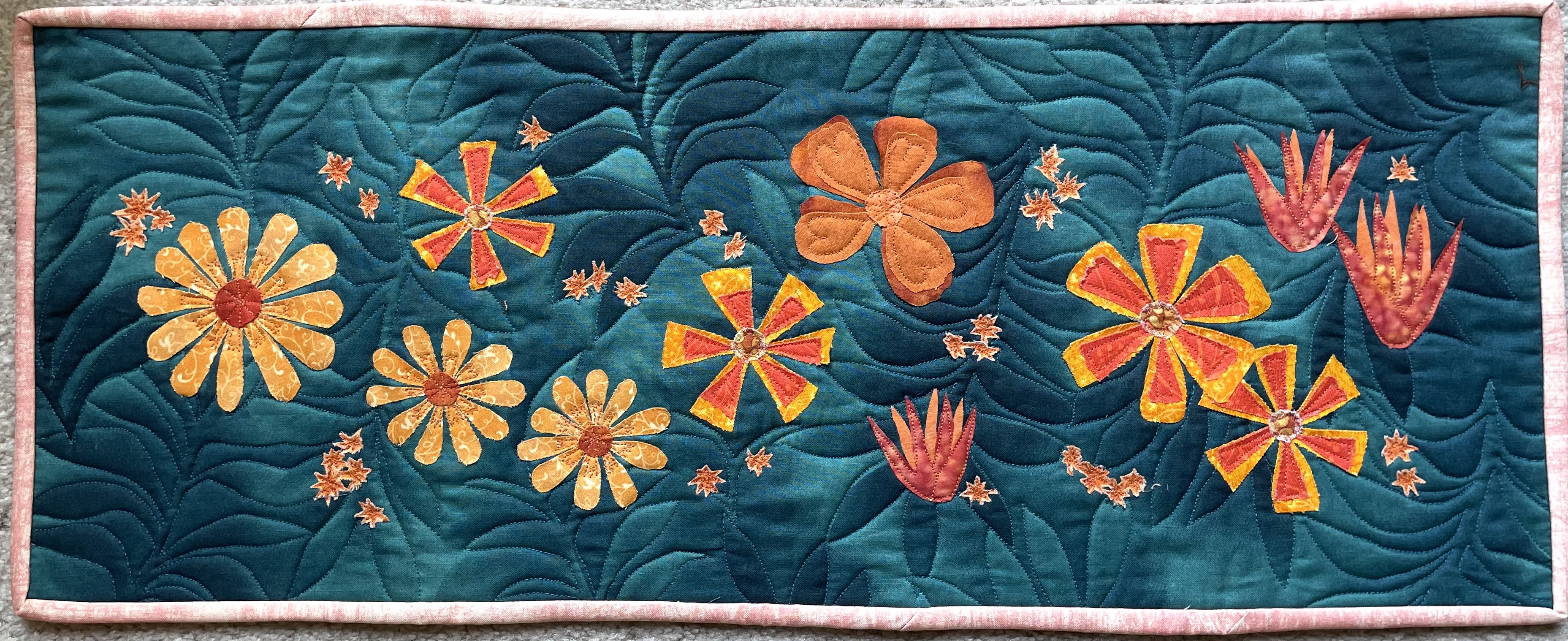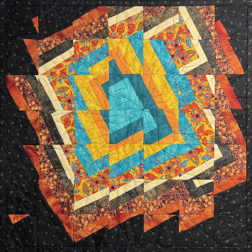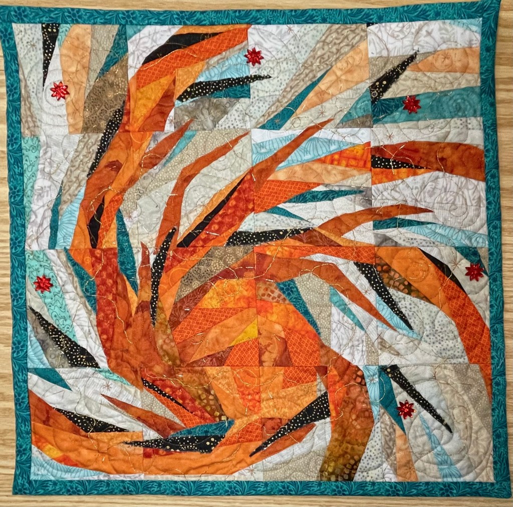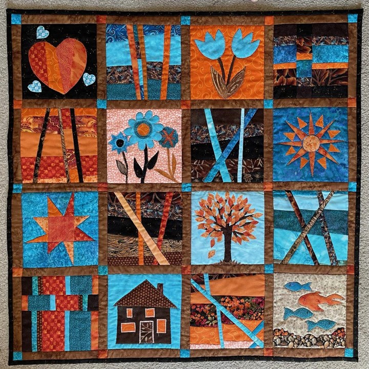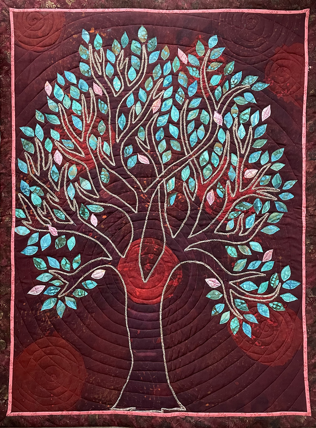 Quilts are made of 3 layers; a top, a layer of batting, and a back. The three layers are sewn together with “quilting”, stitching that goes through all 3 layers. Art quilts are small quilts intended to be hung on the wall. Each of these has a finished edge and a 4″ hanging sleeve on the back.