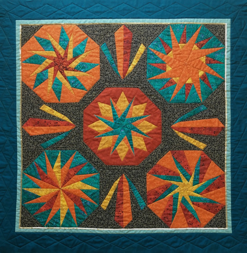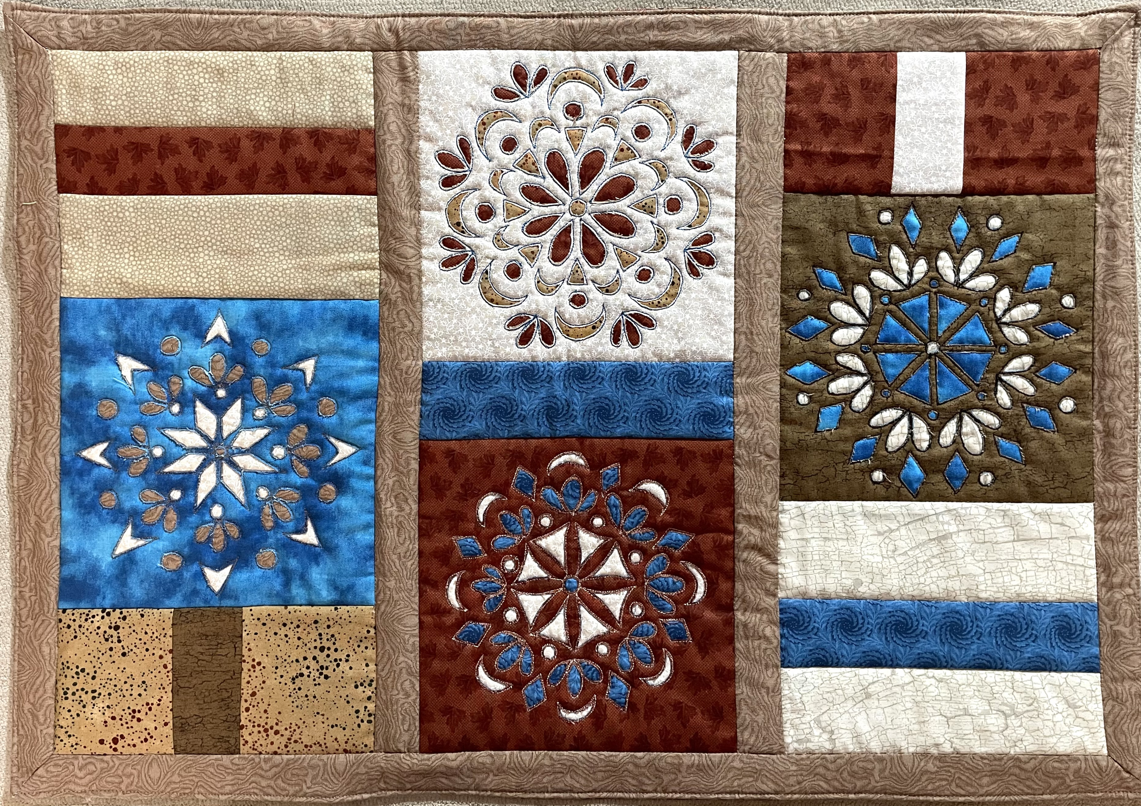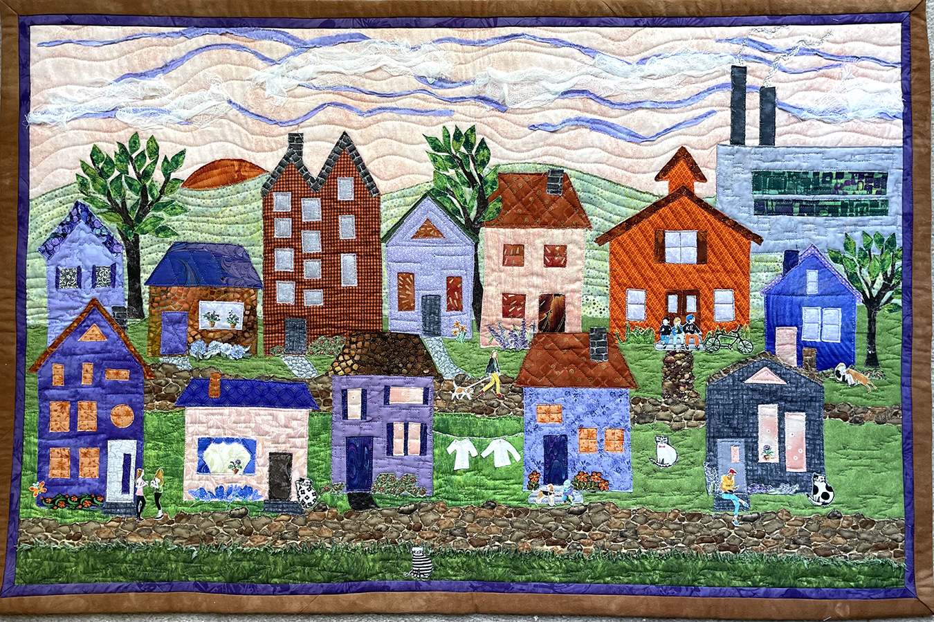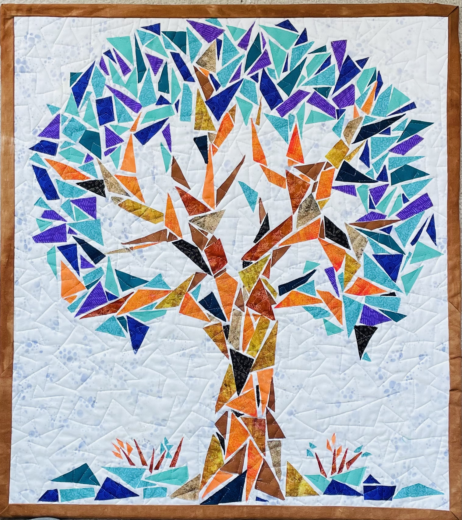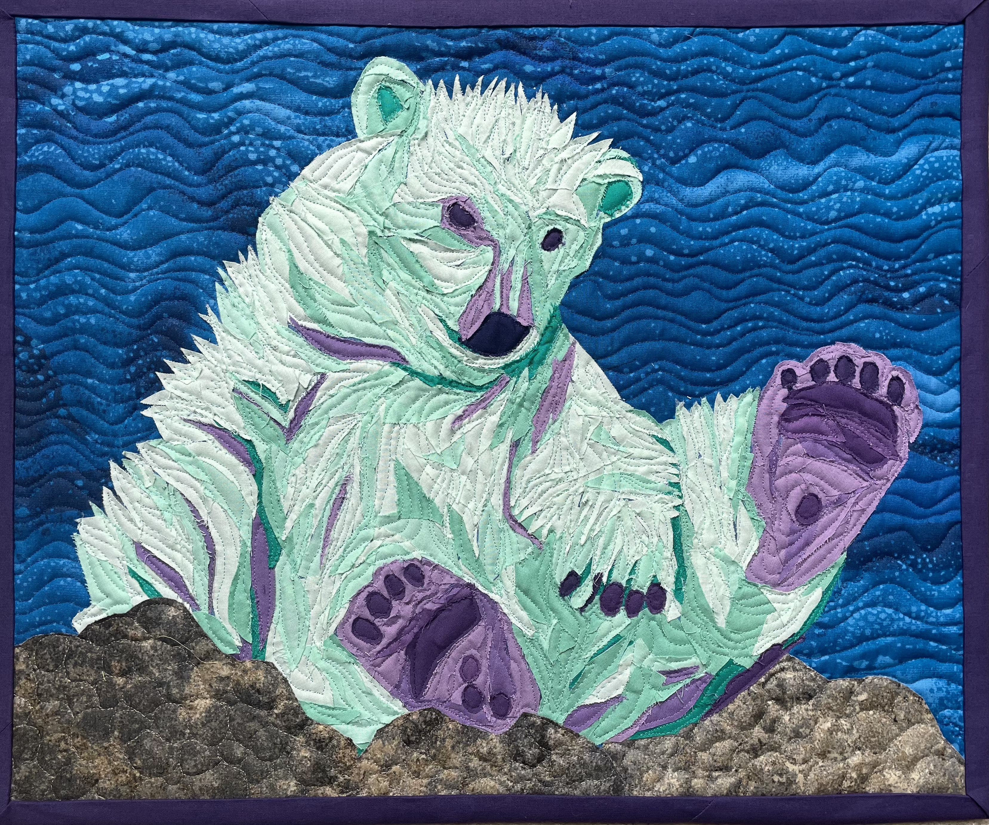 Quilts are made of 3 layers; a top, a layer of batting, and a back. The three layers are sewn together with “quilting”, stitching that goes through all 3 layers. Art quilts are small quilts intended to be hung on the wall. Each of these has a finished edge and a 4″ hanging sleeve on the back.