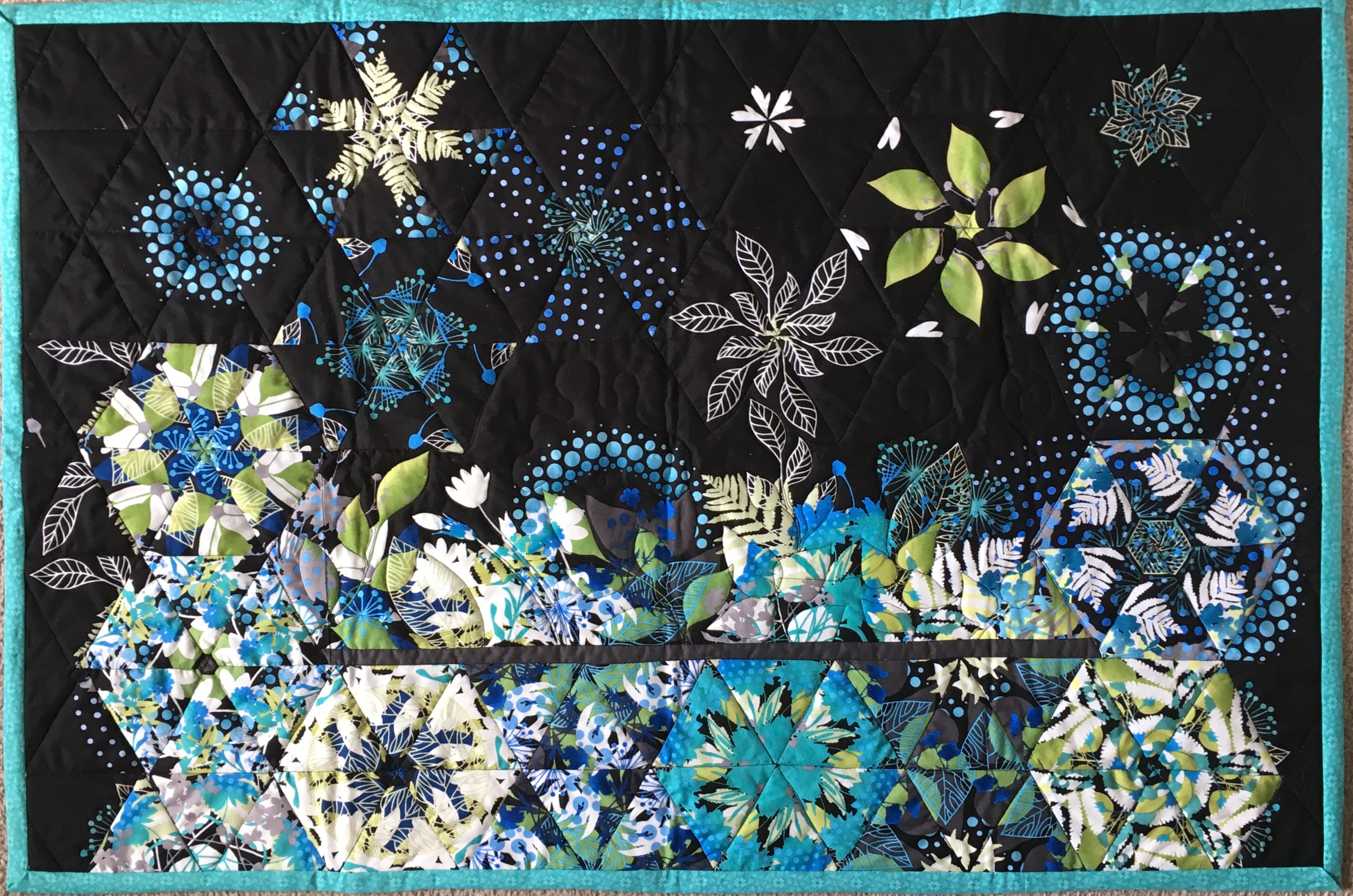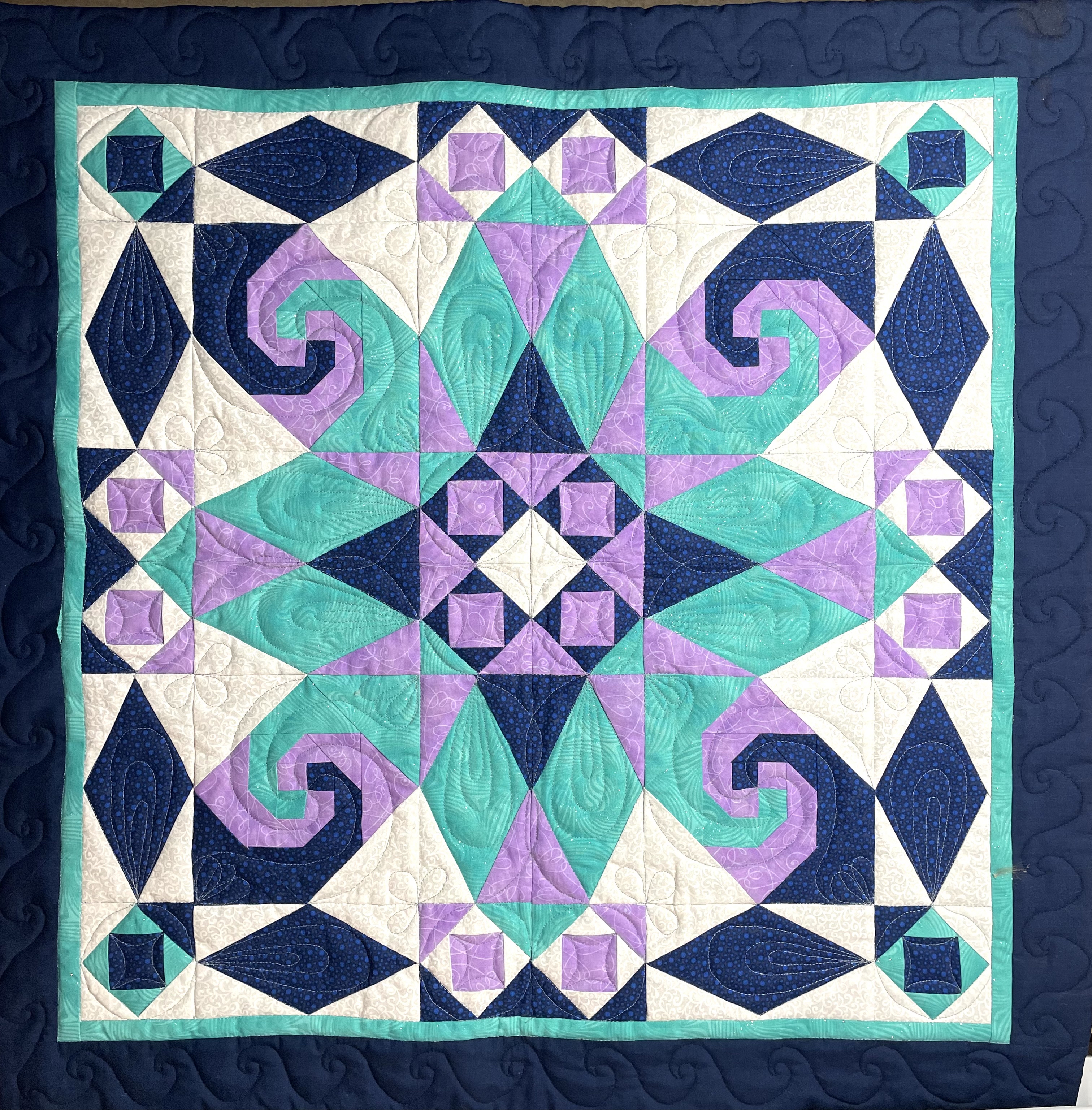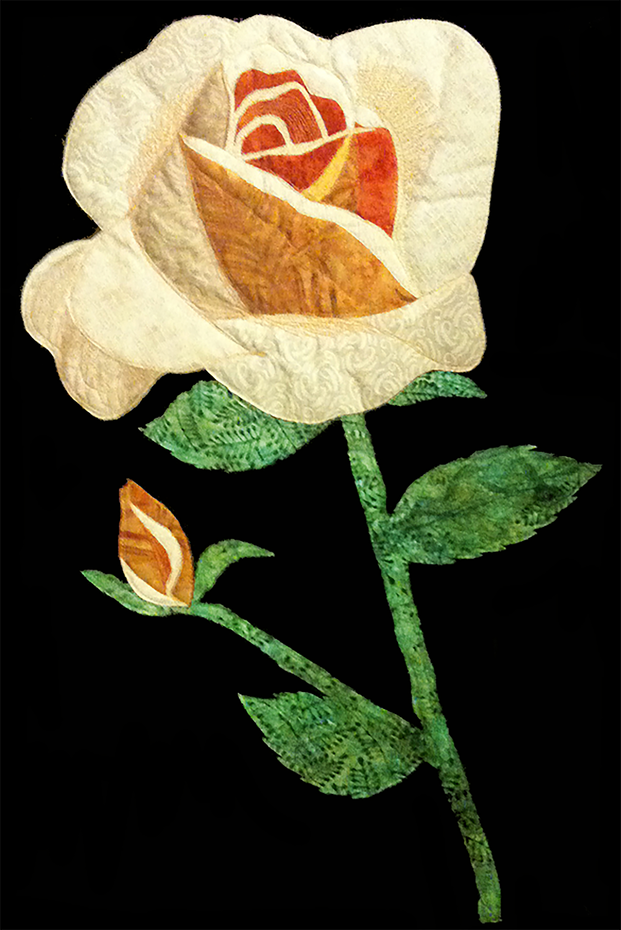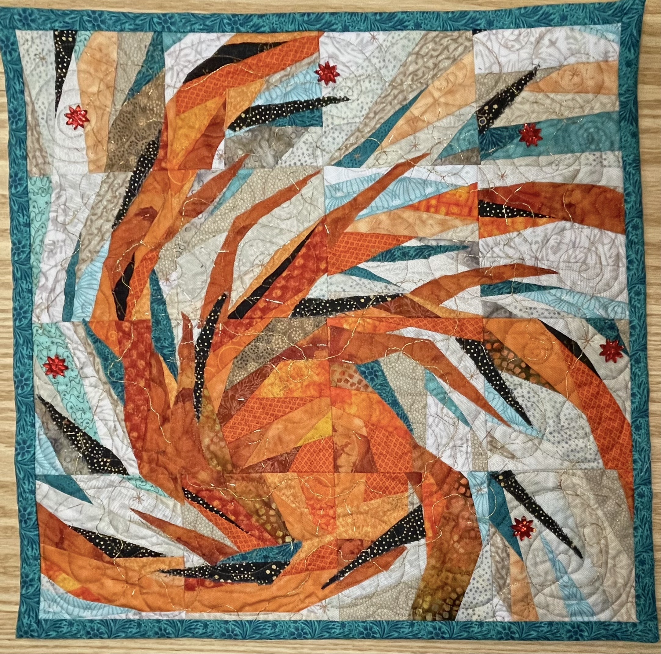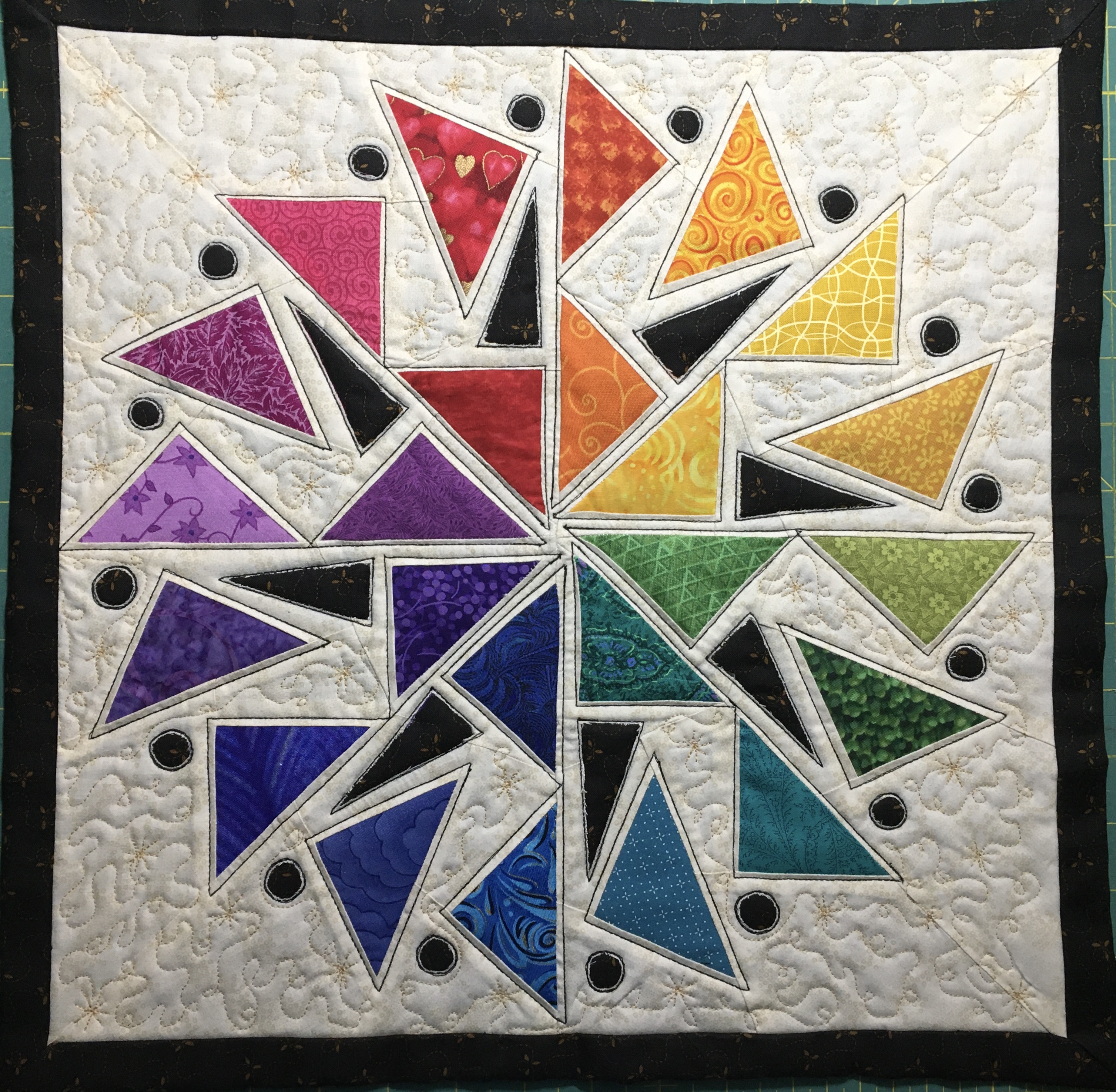 Quilts are made of 3 layers; a top, a layer of batting, and a back. The three layers are sewn together with “quilting”, stitching that goes through all 3 layers. Art quilts are small quilts intended to be hung on the wall. Each of these has a finished edge and a 4″ hanging sleeve on the back.