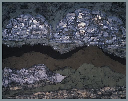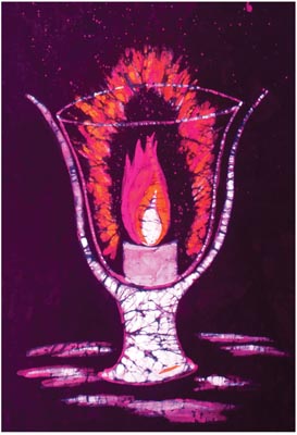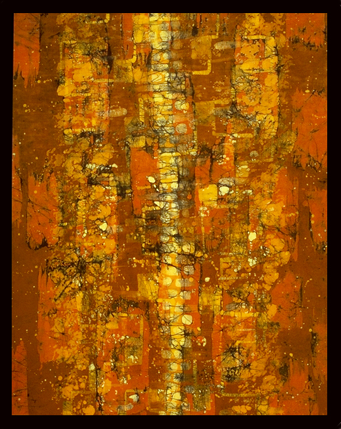 All the artwork on this page is batik. It is made by taking white fabric, painting on it with melted wax where you want it to stay white, and then dyeing the fabric – usually a light color. Once the dye has dried, you paint where you would like it to stay this new color (e.g. yellow) and dye the whole thing a darker color (e.g. orange). You continue waxing and dyeing until you have died the darkest color. Then you take it to the dry cleaners and have the wax taken out.